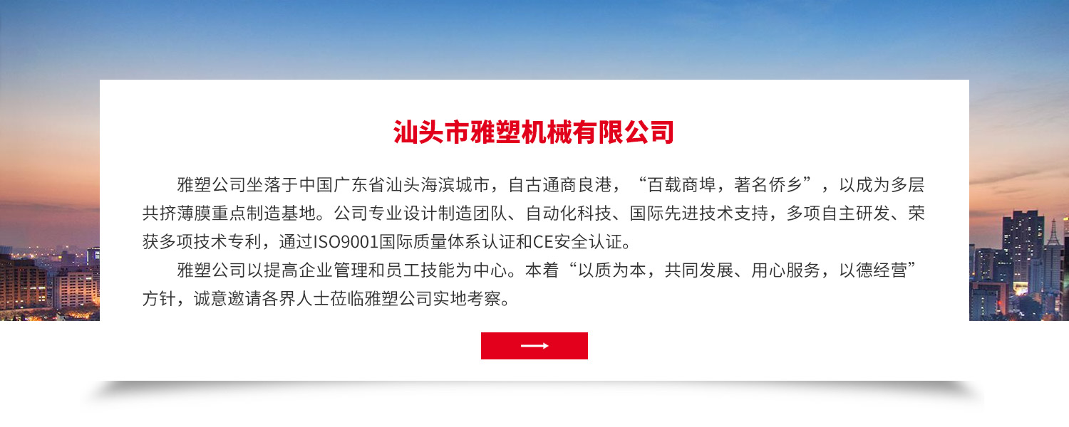 - 雅塑公司坐落于中國廣東省汕頭海濱城市,自古通商良港,“百載商埠,著名僑鄉”,以成為多層共擠薄膜重點制造基地。